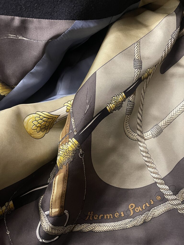 さらに、ボレロの裏地には、お客様のご要望によりエルメスのスカーフを使用してお仕立てしています。