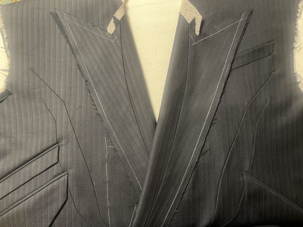 今回のジャケットでは、ダブルブレストで大きなラペルですのでより、シャープな印象を作り出すためラペル上に切り替えを施し、さらにはよりエレガントさを持たせるために、ストライプの角度を微調整し、静かな中に華やぎが宿る表情を設計しています。
