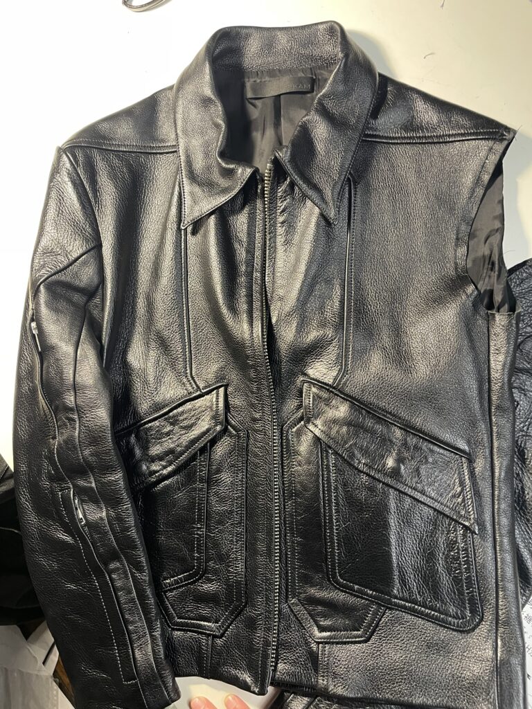 完成後のジャケットは前身頃のすわりやポケット位置、肩から身頃へのつながりが美しく整い、革の立体感と光沢も均一に戻り、お客様が安心して長く着ていただける状態に仕上がりました。